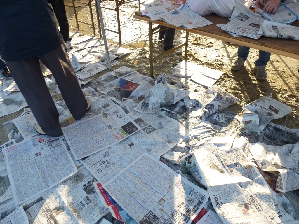 新聞紙を急遽集め、水を吸い取り応急手当